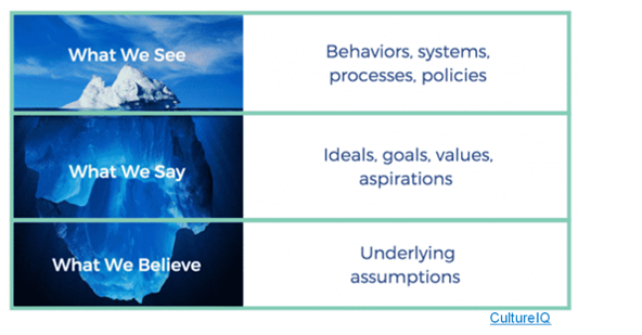 Organizational culture can be visualized as an iceberg, consisting of three interconnected layers: