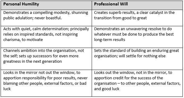Builds enduring greatness through a rare blend of personal humility and relentless determination – placing the success of the organization above personal recognition.